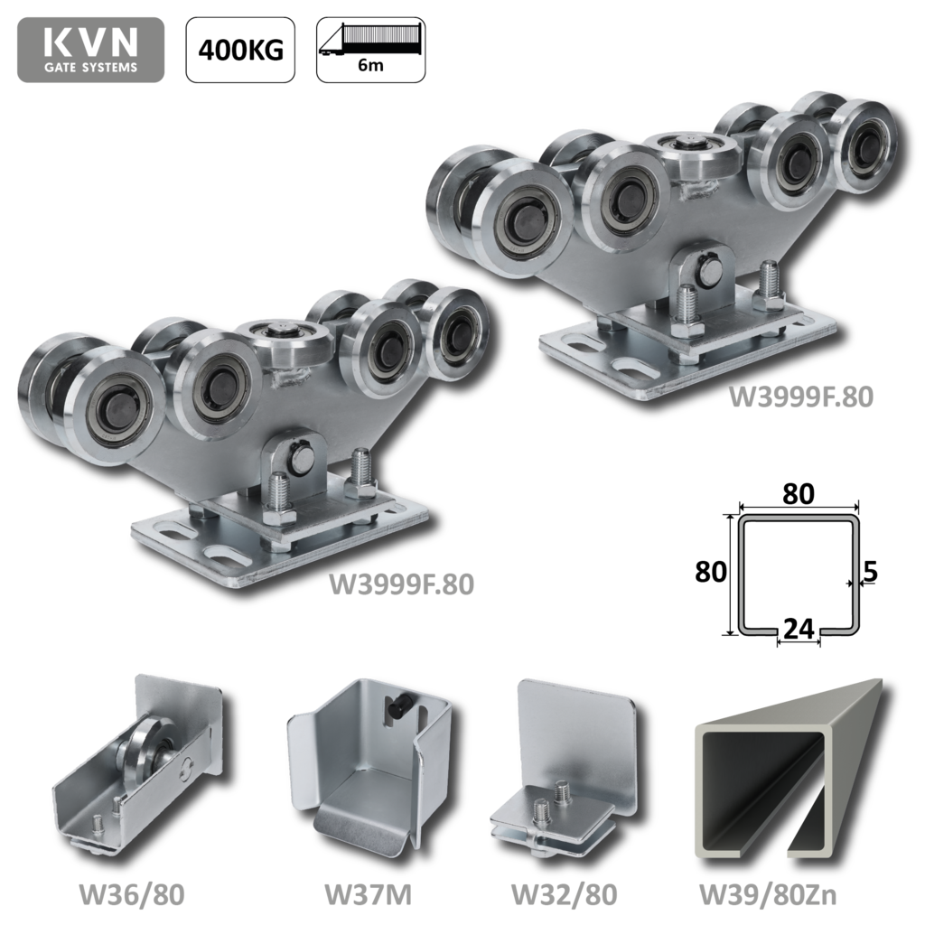 W Set80/Zn-9 - samonosný systém 80x80x5mm posuvnej brány do 400kg/6m otvor (W39/80Zn 6m pozinkovaný profil, 1x W-SET809F)