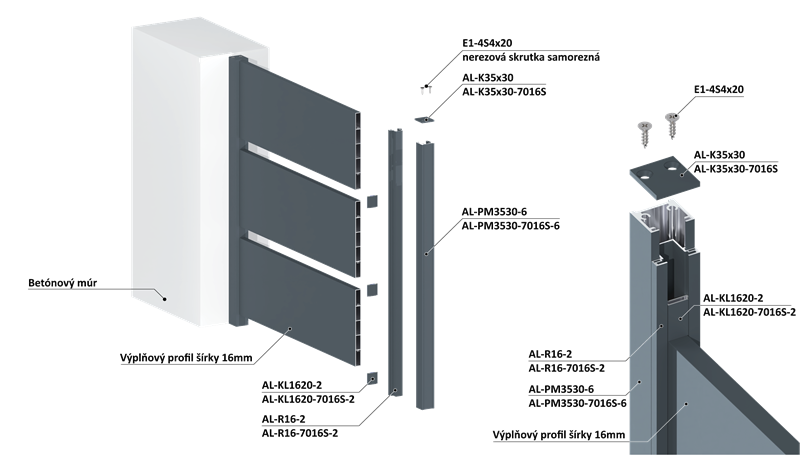 Redukčná lišta slúži na presné uchytenie doskových výplní so šírkou 16 mm do montážnych profilov AL-SP70-7016S-6 a AL-PM3530-7016S-6. Povrchová úprava v štruktúre RAL7016 zabezpečuje elegantný vzhľad a zvýšenú odolnosť voči poveternostným vplyvom. Dĺžka profilu je 2000 mm, čo umožňuje jednoduchú manipuláciu a flexibilitu pri montáži.