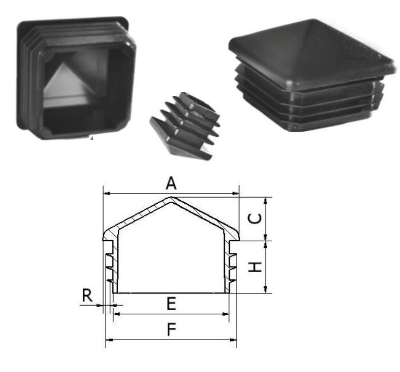 | Kód | Tvar | Rozmer AxA [mm] | R [mm] | C [mm] | H [mm] | E [mm] | F [mm] | Hmotnosť | |